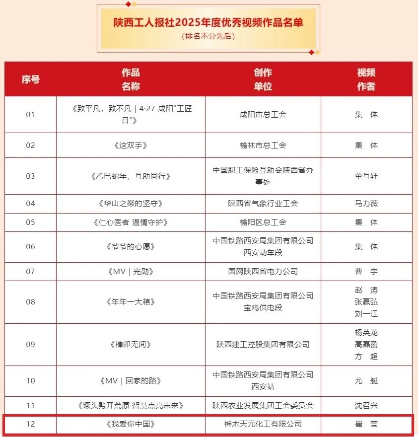 天元公司視頻作品獲評陜西工人報社2025年度優秀視頻作品 -