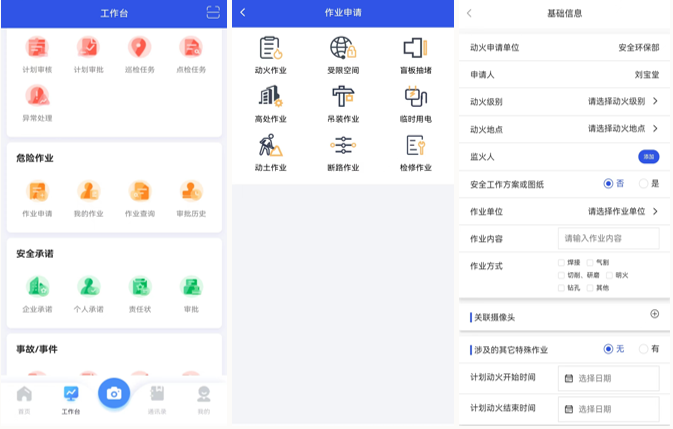 作業票管理是天元公司智慧安監管理平臺中一項重要功能模塊,包括作業申請、作業查詢等功能,涵蓋了動火作業、受限空間、盲板抽堵、高處作業、吊裝作業、臨時用電、動土作業、斷路作業、檢修作業9類作業,作業票系統流程具體分為基礎信息、作業單位、現場確認、化驗分析、作業審核、作業驗收6個步驟,實現了作業申請—審批—簽字—票證歸檔全過程電子化管理。