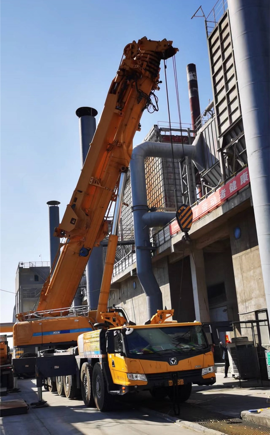 早上8:30,280噸吊車進入檢修現場,經過吊車師傅及檢修人員的精心組裝,吊車具備作業條件,為拆除工作做好了準備。10:30分,隨著指揮人員一聲令下,在生產技術部的指導和檢修師傅們的密切配合下,舊煤氣換熱器拆裝和新換熱器的安裝僅用了3個小時,在高效完成拆裝的同時,為后續各窯煤氣換熱器的吊裝積累了豐富的經驗。