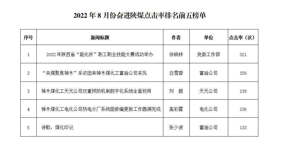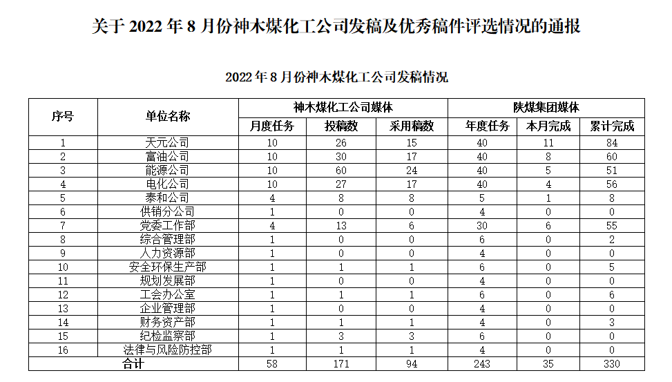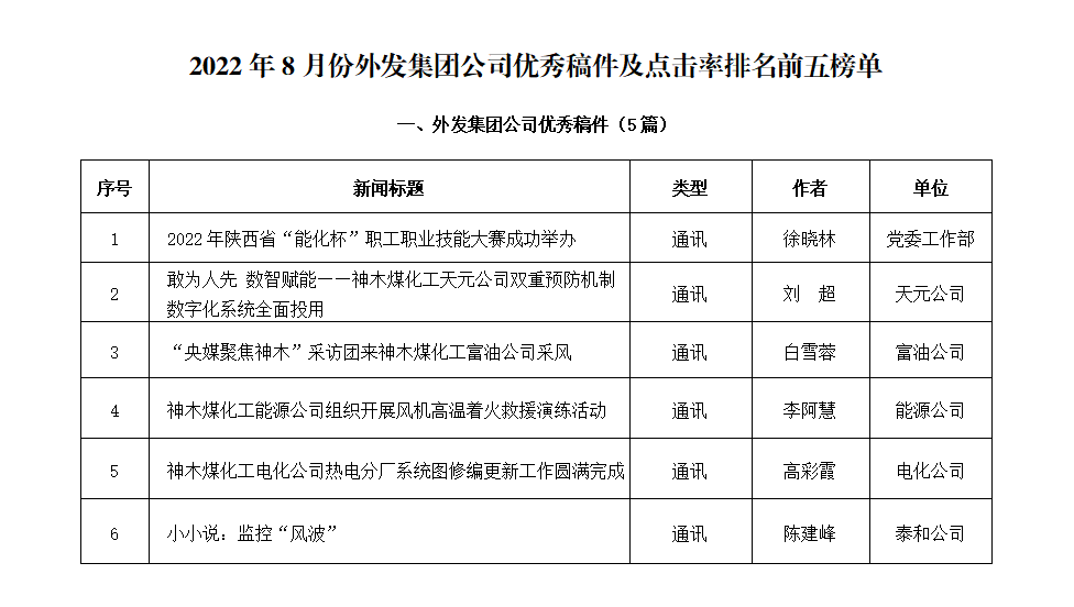 關于2022年8月份神木煤化工公司發稿及優秀稿件評選情況的通報