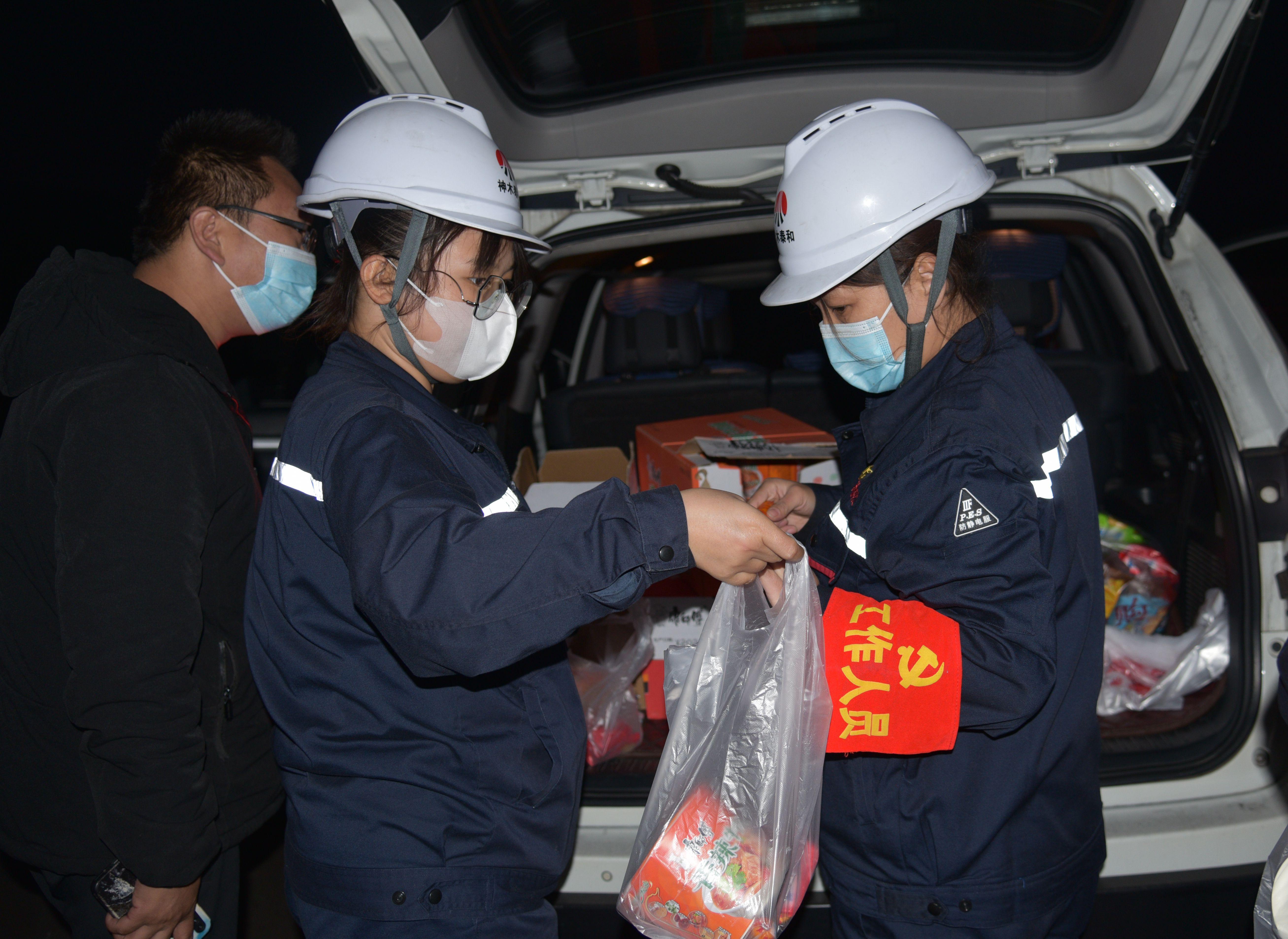 近日,由于周邊疫情嚴峻,部分貨車司機短暫滯留在廠內,吃飯成了司機們的大問題。得知這一情況后,11月23日,神木煤化工泰和公司黨員服務隊由生產黨支部書記溫補雄和綜合黨支部書記葉萍帶隊,向滯留在廠區的司機送去了熱飯、熱水、桶裝方便面,火腿等食物,將企業的溫暖送到每一位司機的心坎上,幫助他們渡過暫時的難關。