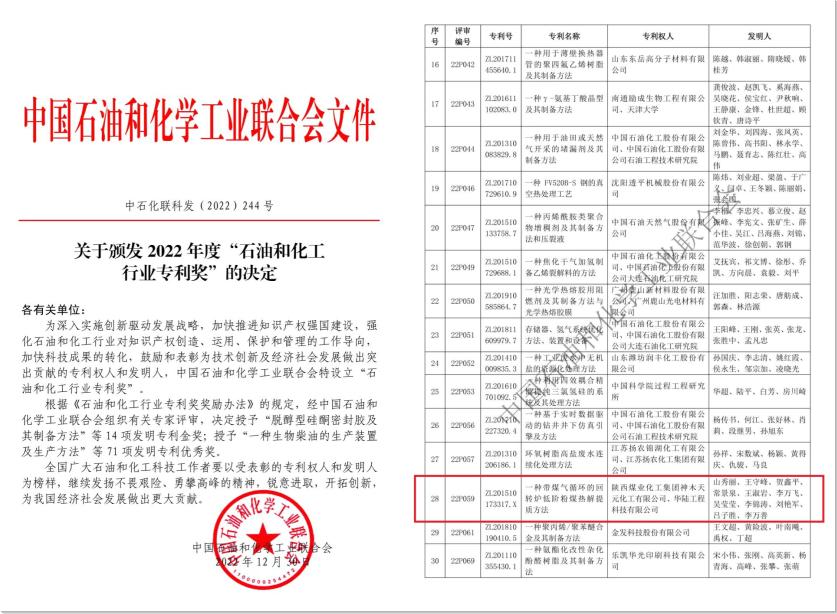 近日,中國石油和化學工業聯合會公布了2022年度“石油和化工行業專利獎”名單,神木煤化工天元公司“一種帶煤氣循環的回轉爐低階粉煤熱解提質方法”發明專利榮獲2022年度中國石油和化工行業專利優秀獎。