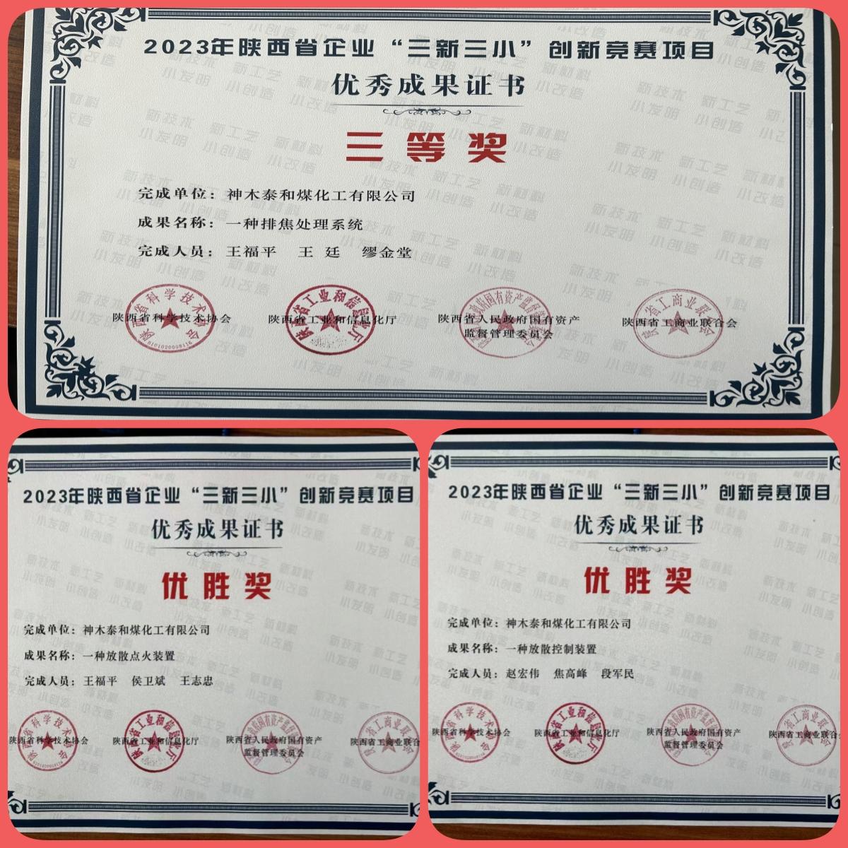 近日,2023年陜西省企業“三新三小”創新競賽活動評審結果正式公布,神木煤化工泰和公司“一種排焦處理系統”項目榮獲三等獎,“一種放散點火裝置”項目和“一種放散控制裝置”項目分別獲得優勝獎。