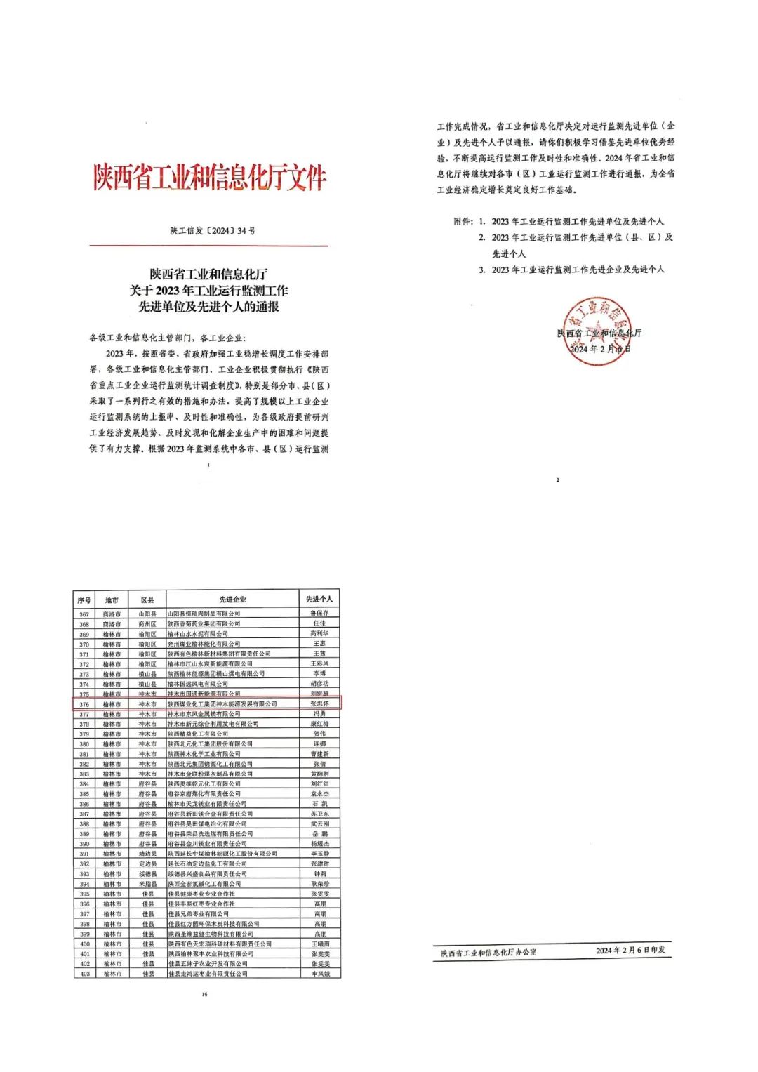 近日,從陜西省工業和信息化廳文件《陜西省工業和信息化廳關于2023年工業運行監測工作先進單位、先進個人的通報》獲悉,神木煤化工能源公司榮獲陜西省工業和信息化廳“2023年工業運行監測工作”先進單位榮譽稱號。該公司員工張忠懷榮獲“2023年工業運行監測工作”先進個人。