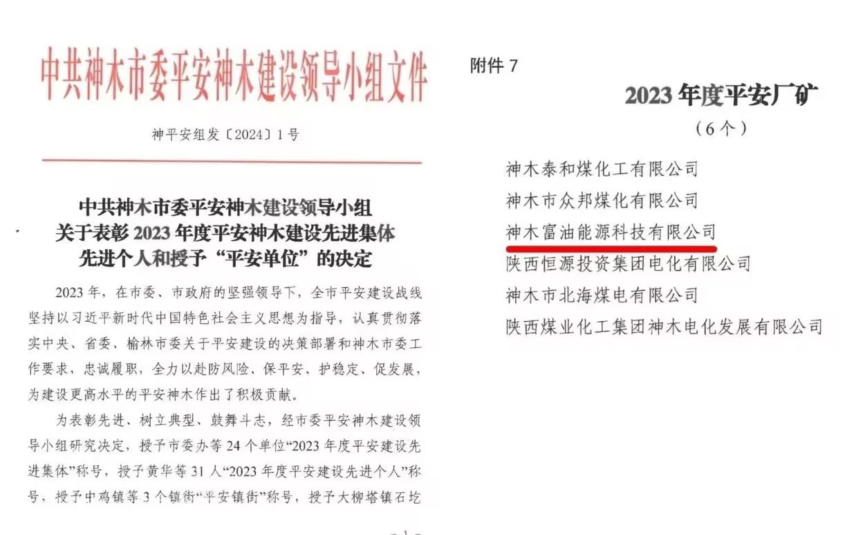 富油公司榮獲神木市2023年度“平安廠礦”榮譽稱號