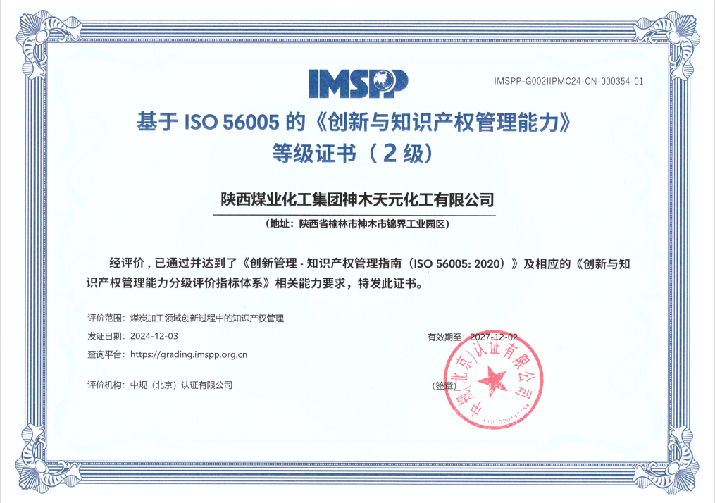 近年來,天元公司認真貫徹落實陜煤集團和神木煤化工公司關(guān)于知識產(chǎn)權(quán)管理體系建設(shè)的相關(guān)要求,不斷推動創(chuàng)新與知識產(chǎn)權(quán)工作提質(zhì)增效。先后榮獲中國專利優(yōu)秀獎、陜西省專利一等獎,截至目前,公司獲得國家有效授權(quán)專利140件,其中發(fā)明專利47件,實用新型專利93件;同時,多項創(chuàng)新成果先后在陜西省創(chuàng)新方法大賽、陜西省企業(yè)“三新三小”創(chuàng)新競賽、榆林市“秦創(chuàng)原”高價值專利轉(zhuǎn)移轉(zhuǎn)化大賽中獲獎。