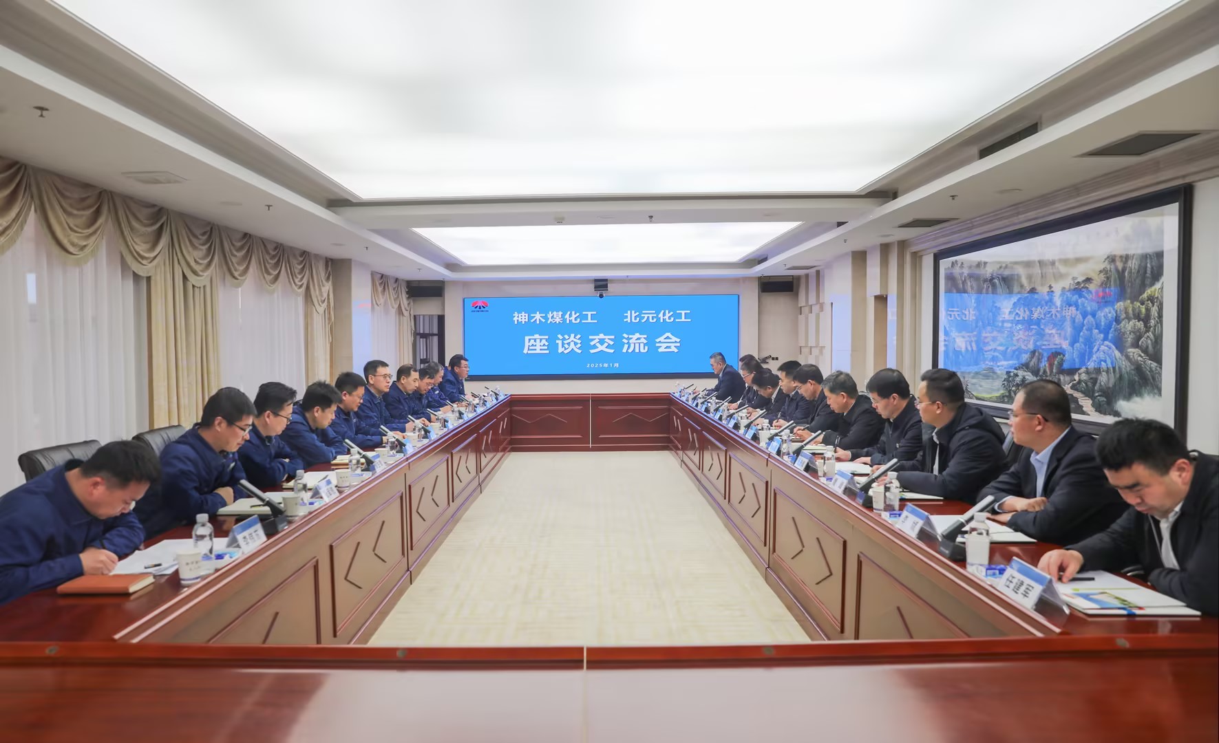 1月16日,神木煤化工公司黨委書記、董事長雷宏春一行到北元集團,就新形勢下煤化工產品市場趨勢、業務拓展、合作共贏等方面與北元集團黨委書記、董事長史彥勇及班子成員座談交流。