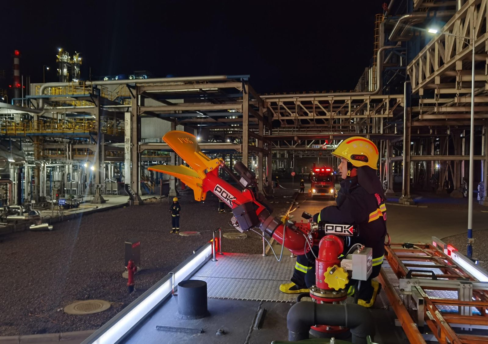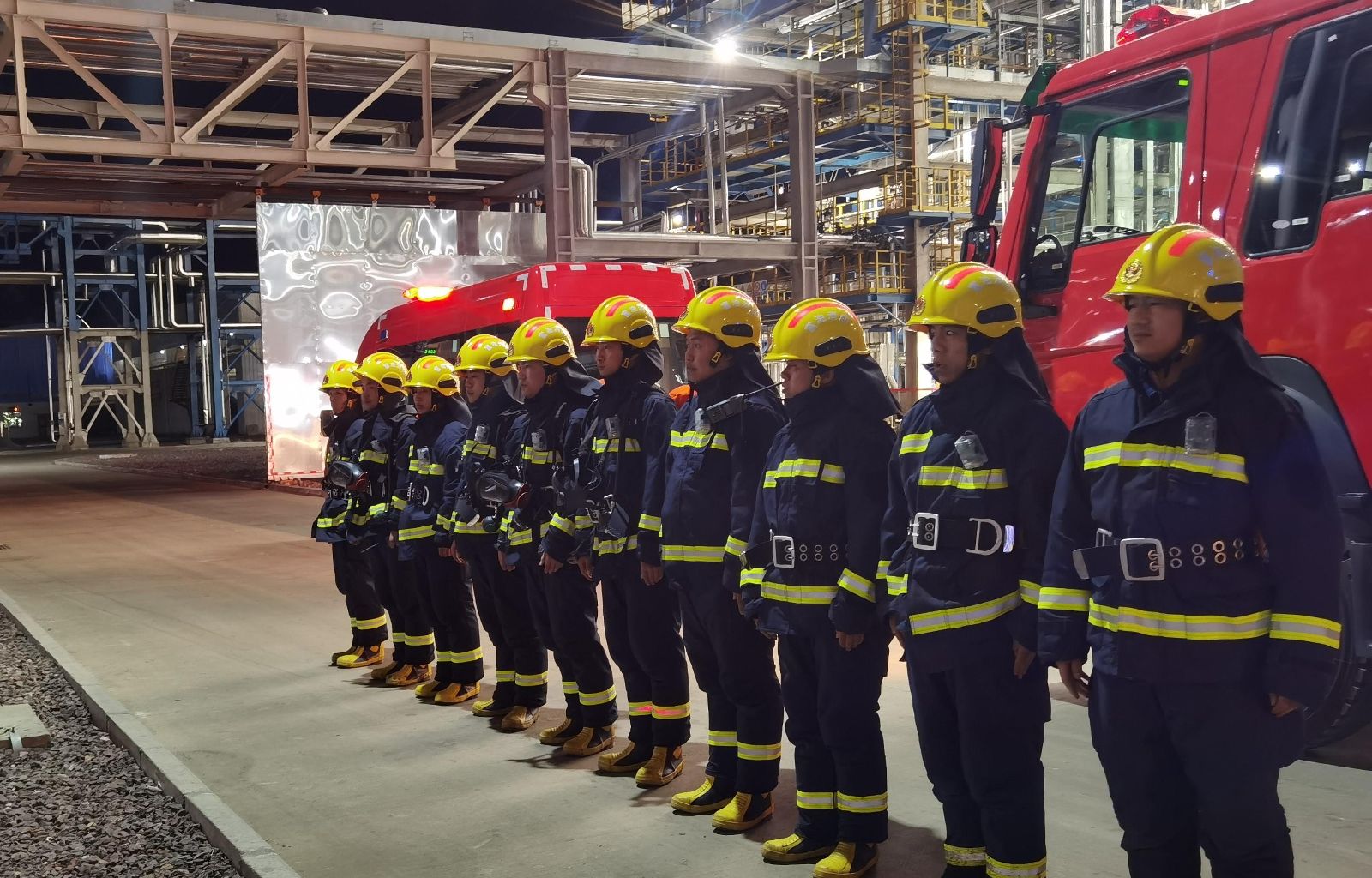 3月11日晚,富油公司二期項目裝置區突然警笛大作,三輛消防車和大量消防人員出現在裝置區,一場夜間消防實戰拉動演練正在上演。