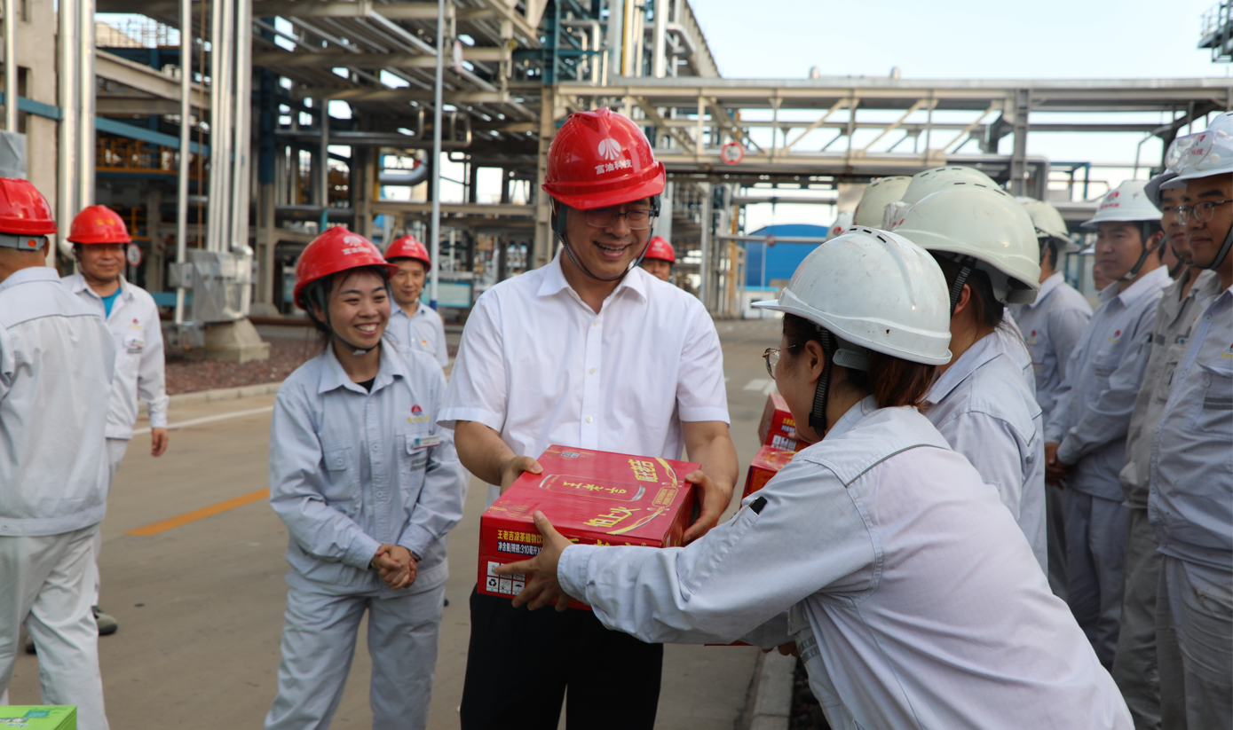 蘭新哲一行聽取該公司關于黨的建設、生產經營和工會工作的匯報,先后參觀了中控室、文化展廳、研發中心和勞模工作室等,詳細了解了50萬噸/年環烷基油項目生產運行、技術研發和勞模工作室建設等情況,并與技術人員、工匠和勞模親切交談、合影。
