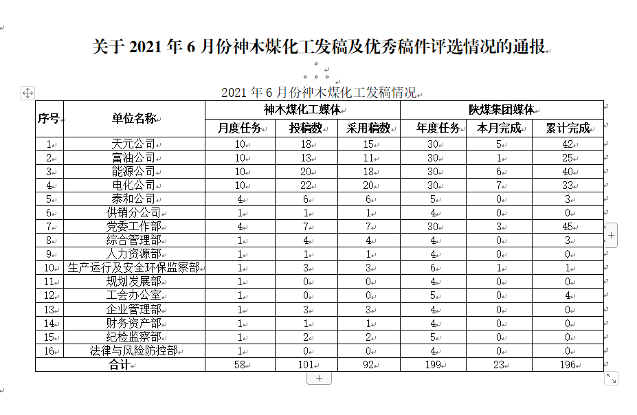 關(guān)于2021年6月份神木煤化工公司發(fā)稿及優(yōu)秀稿件評(píng)選情況的通報(bào)
