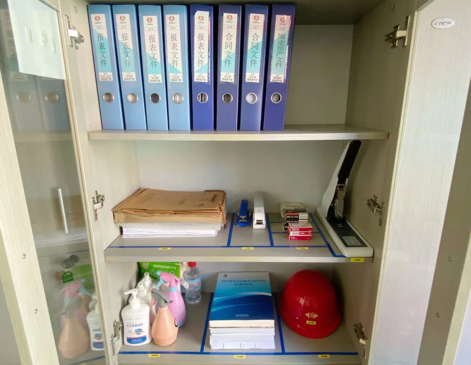物品定位,文件入盒,文件盒按顏色分區(qū)擺放,書籍排列整齊,清單一目了然。走進(jìn)電化公司行政辦公室,干凈整潔的桌面、擺放整齊的書架格外矚目。