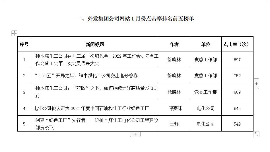 關于2022年1月份神木煤化工公司發稿及優秀稿件評選情況的通報