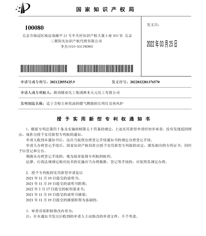 近日,神木煤化工天元公司申請的“適于含粉塵和焦油的煤氣燃燒的長明燈及熱風爐”實用新型專利獲得國家知識產權局授權。