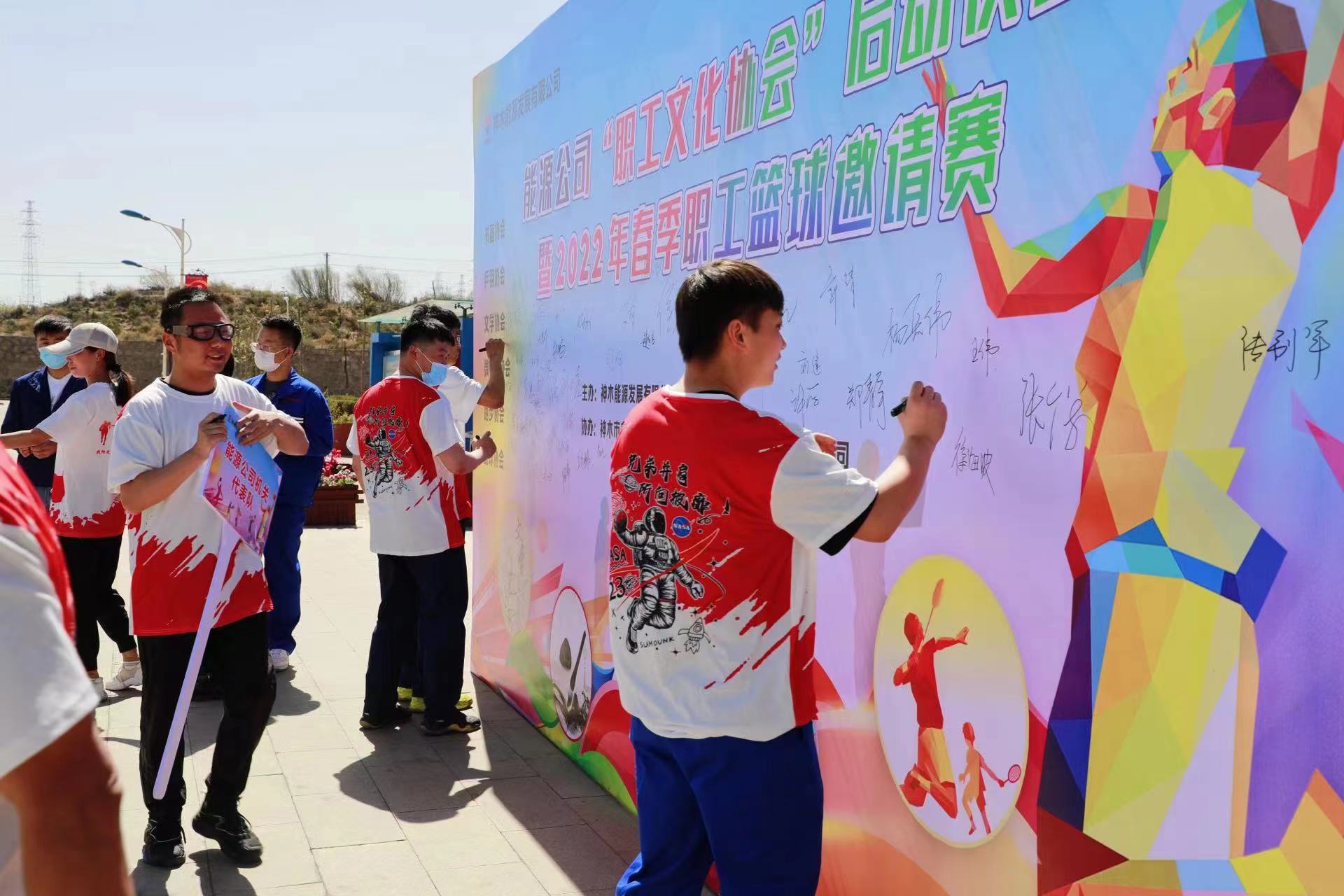 活動(dòng)現(xiàn)場,大家集體在背景墻上留下了自己獨(dú)特的紀(jì)念簽名。另外,能源公司特邀請(qǐng)兄弟單位及各分公司“打響了”2022年春季職工籃球邀請(qǐng)賽,大家秉持“友誼第一,比賽第二”的原則,在球場上共展風(fēng)采,齊放活力。
