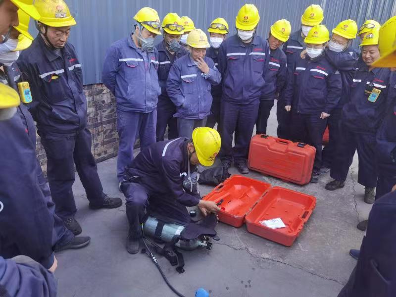 此次實訓內容主要包括呼吸器的用途、構造及操作方法。為了充分發揮先鋒模范作用,由勞動模范劉徐軍實操示范,并講解注意事項。隨后,以“師帶徒”“老帶新”的方式激發了大家的學習熱情,員工們輪流操作,對空氣呼吸器的使用方法進一步熟練。