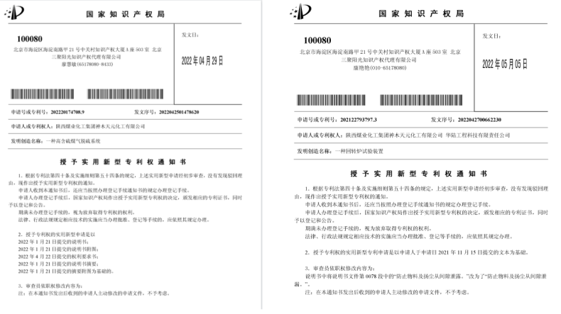 近日,神木煤化工天元公司申請的“一種高含硫煤氣脫硫系統”和“一種回轉爐試驗裝置”實用新型專利獲得國家知識產權局授權。